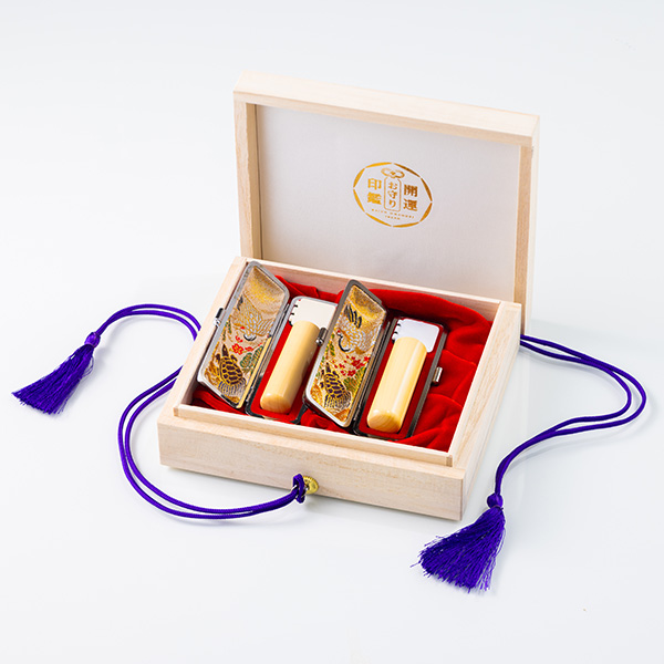 当店では美しい飴色にこだわり、選びぬかれた色合いと硬さを持った白水牛のみを選び、金持神社で「開運・金運祈願」をして頂いた印材に、開運の運気と想いを込めて刻印致します。