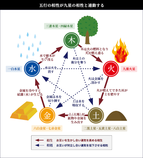 自然界の5つの要素(木・火・土・金・水)のことで、それぞれに「生かし合う」「打ち消し合う」といった関係性があります。