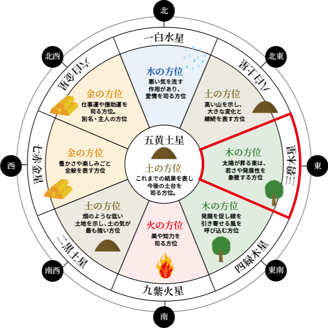九星気学における「三碧木星(さんぺきもくせい)」は東に位置し、“木”の気を象徴する星。