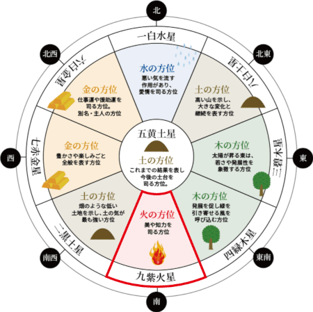 九星気学における「九紫火星(きゅうしかせい)」は、南を象徴し、“火”の気を持つ星。